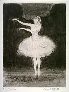 Desde 1909/1910 dibujó y grabó muchas representaciones de los ballets rusos. Oppler registró sus impresiones de las representaciones de danza directamente mientras asistía a las representaciones en el teatro, para lo cual inventó un lápiz iluminado especial que le permitió esbozar sus impresiones del movimiento en el auditorio a oscuras. En el campo de la representación de escenas de ballet, se convirtió en el cronista alemán más importante de la danza artística. Más tarde reconstruyó y corroboró sus impresiones momentáneas esbozadas de figuras en movimiento en dibujos, grabados, litografías, acuarelas y pinturas. Los valores tonales pictóricos de sus aguafuertes fueron muy expresivos. Esta técnica le permitió una amplia gama de valores claros/oscuros. Ernst Oppler siguió siendo un observador apasionado y cultivó la estética del ballet a lo largo de su vida, lo que le valió el sobrenombre de pintor de danza. A diferencia de Edgar Degas, quien había representado bailarinas en el descanso, durante el entrenamiento, atándose las zapatillas de ballet y haciendo reverencias y era considerado un pintor de ballet, pero en realidad solo registró un género, Oppler se centró en el movimiento de danza en sí, el trabajo de ballet y los artistas individuales, en su mayoría destacados en primer plano (Anna Pavlova, Tamara Karsavina, Vaslav Nijinsky y otros). Oppler pronto fue invitado explícitamente a dibujar durante los ensayos y actuaciones, razón por la cual, por ejemplo, los ensayos con Richard Strauss en París están documentados con dibujos y grabados.[24]