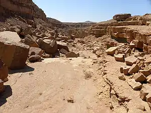 Wadi en Makhtesh Ramon, Israel, que muestra erosión y colapso por gravedad en sus orillas.
