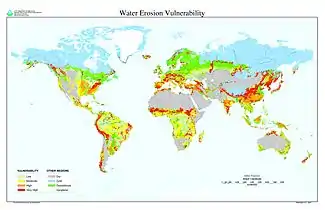 Mapa mundial que indica las áreas que son vulnerables a las altas tasas de erosión hídrica.