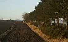 Un cortavientos (la fila de árboles) plantado al lado de un campo agrícola, que actúa como un escudo contra los fuertes vientos. Esto reduce los efectos de la erosión del viento y proporciona muchos otros beneficios.
