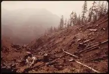 En este claro, casi toda la vegetación ha sido arrancada de la superficie de las laderas empinadas, en un área con lluvias muy fuertes. La erosión severa ocurre en casos como este, causando la sedimentación de la corriente y la pérdida de la capa superior del suelo rica en nutrientes.