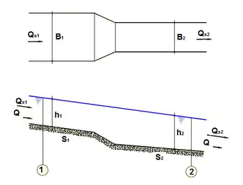 Si bien el trabajo de Laursen es uno de los más antiguos, analiza distintas situaciones de contracción del cauce principal y llanuras de inundación, por lo que se torna uno de los más completos. Para lecho vivo, contracción tanto del canal principal como de la llanura de inundación, y diferentes coeficientes de rugosidad aguas arriba y abajo, Laursen propone:[1]