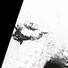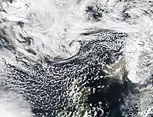 | 21 al 23 de mayo | ![]() Islandia es apenas visible en la extremidad noreste, donde la exploración ocasional revela la inyección de ceniza volcánica en el aire sobre las nubes del Ártico donde los vientos del este la llevan hacia Groenlandia, 21 al 23 de mayo. GOES-EAST | |