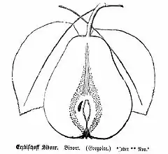![]() 'Erzbischof Sibour' sinónimo: 'Arzobispo Sibour' Dibujo seccional y hoja de la variedad pera Arzobispo Sibour. | ||