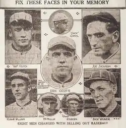 - Eddie Cicotte: Pitcher ganador en varias temporadas con más de 25 juegos. (Una historia dice que a Cicotte se le había prometido un bono de $ 10,000 dólares - equivalente a $ 149,000 de hoy - si ganaba 30 juegos; el dueño del equipo Charles Comiskey le negó cinco aperturas hacia el final de la temporada, quien hizo que el manager Kid Gleason lo reemplazara " guardar su brazo para la Serie Mundial ". Sin embargo, la historia sigue sin fundamentarse. Cicotte fue 29-7 en la temporada.) Si no hubiese participado en este arreglo, hubiera sido elegido al Salón de la Fama. Tenía todos los méritos para ello.