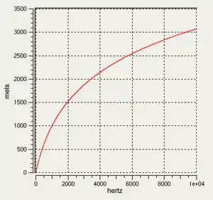 El punto de referencia entre esta escala y la frecuencia normal se define equiparando un tono de 1000 Hz, 40 dB por encima del umbral de audición del oyente, con un tono de 1000 mels. Por encima de 500 Hz, los intervalos de frecuencia espaciados exponencialmente son percibidos como si estuvieran espaciados linealmente. En consecuencia, cuatro octavas en la escala de hercios por encima de 500 Hz se comprimen a alrededor de dos octavas en la escala Mel. El nombre mel viene de la palabra melodía para indicar que se basa en la percepción humana de los tonos.