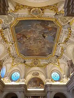 La bóveda está decorada con ricos estucos blancos y dorados y el Triunfo de la Religión y de la Iglesia, hermoso fresco de Corrado Giaquinto, pintor que fue mandado llamar por Fernando VI. La estancia se ilumina por cuatro grandes farolas de estilo imperio parcialmente doradas.