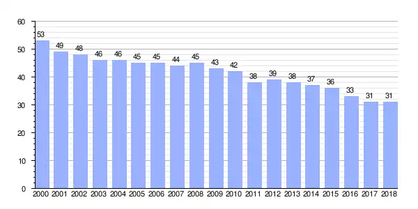 | Gráfica de evolución demográfica de Escarís entre 2000 y 2018 |