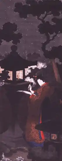 Suzuki Harunobu es uno de los primeros artistas de Ukiyo-e en representar una escena nocturna con fondo negro.[9] Sin embargo, en su obra se sigue notando la ausencia de sombras y la fuente de luz indeterminada. La otra excepción temprana en la que aparecen fondos negros la encontramos en las Ishizuri-e,[10] un tipo de estampas que imitaban los calcos de relieves que se realizan con grafito y papel. Los fondos negros, en este caso, no están necesariamente relacionados con la noche.