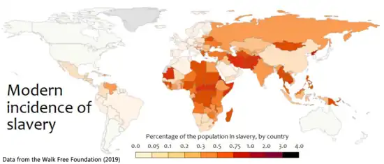 La esclavitud, como institución jurídica, es una situación por la cual la propiedad de una persona pasa a ser tomada por otra, es una forma particular de relaciones de producción, característica de un determinado nivel de desarrollo de las fuerzas productivas en la evolución de la historia económica. El número de esclavos en la actualidad es de entre 9 millones[1] y 27 millones,[2][3][4] el número más alto de la historia de la humanidad.[5][6] La mayoría son esclavos por deudas, principalmente en Asia del Sur, quienes se encuentran bajo la servidumbre por deudas contraídas con usureros, en ocasiones incluso durante generaciones completas.[7] La práctica de la trata de personas tiene por objetivo principalmente la prostitución de mujeres y niñas.[8] Se trata de la industria criminal de mayor crecimiento y se espera que en un futuro supere al tráfico de drogas.[8][9]