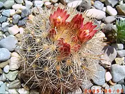 Es una planta que crece en grupos o forma colonias con un máximo de 50 individuos. Los tallos son cilíndricos lisos, alcanzan un diámetro de 3 cm y una altura de hasta 12 cm . Las espinas cubren los brotes, dando a la planta un aspecto amarillento. Las areolas miden de 7 a 10 mm de largo. Las nueve a doce espinas centrales son fuertes, rectas y de color amarillo y tienen una longitud de 0,9 a 1,9 centímetros. Las 30-35, espinas radiales son rígidas y rectas, de color blanco y miden de 6 a 11 mm . Las flores son de color rosa y alcanzan un diámetro de 15 a 16 mm . Los frutos son verdes amarillentos y de 6 a 14 mm de largo.
