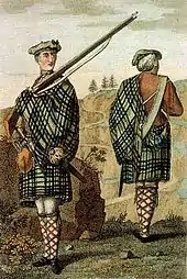 La combinación de parentesco agnaticio y un sistema feudal de obligaciones ha sido vista como la creación del sistema de clanes de las Tierras Altas.[115] El jefe de un clan era generalmente el hijo mayor del último jefe de la rama más poderosa.[116] Las familias más importantes de un clan formaban el fine, a menudo visto como el equivalente de los lairds en las Tierras Bajas, y proporcionaban consejos de paz y liderazgo en la guerra,[117] y por debajo de ellos estaban los daoine usisle (en gaélico) o tacksmen (en escocés), quienes administraban las tierras del clan y recogían la rentas.[118] En las islas y a lo largo de la costa occidental adyacente también estaban los buannachann, que actuaban como una élite militar, defendiendo las tierras del clan de los ataques y tomando parte en los ataques contra los enemigos del clan. La mayor parte de los seguidores del clan eran arrendatarios, que suministraban mano de obra para los jefes del clan y a veces actuaban como soldados. En la época moderna por lo general ellos tomaban el nombre del clan como su apellido, convirtiéndolo en un multitudinario, aunque a menudo ficticio, grupo de parentesco.[116] Debido a que los clanes de las Tierras Altas no eran una amenaza directa para el gobierno en la Restauración, o para las relaciones con Inglaterra, no se puso el mismo esfuerzo en la supresión de su independencia como había pasado con las fronteras, hasta después de la Revolución Gloriosa.[119] El cambio económico y la imposición de la justicia real habían comenzado a socavar el sistema de clanes antes del siglo XVIII, pero el proceso se aceleró después de la rebelión de 1745, con el Highland dress prohibido, el desarme forzoso de los miembros de clanes, la compra obligatoria de las jurisdicciones hereditarias, el exilio de muchos jefes y el envío de los hombres ordinarios del clan a las colonias como mano de obra contratada. Todo esto redujo en gran medida a los líderes del clan a la condición de simples landholders dentro de una generación.[120]