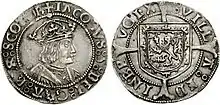 Jacobo VI fue coronado como Rey de los escoceses a los 13 meses el 29 de julio de 1567.[22] Fue criado como protestante, mientras que el país era gobernado por una serie de regentes. En 1579 el francés Esmé Stewart, Señor d'Aubigny, primo carnal del padre de Jacobo, lord Darnley, llegó a Escocia y rápidamente se estableció como valido y hombre más cercano a Jacobo, que en ese momento tenía 13 años de edad;[23] Esmé Estuardo fue creado Conde de Lennox por el rey en 1580, y Duque de Lennox en 1581.[24] Lennox perdió la confianza de los calvinistas escoceses y en agosto de 1582, en lo que se conoció como el Ruthven Raid, los condes protestantes de Gowrie y Angus hicieron prisionero a Jacobo y obligaron a Lennox salir de Escocia.[25] Después de que Jacobo fuera liberado en junio de 1583, asumió progresivamente el control de su reino. Entre 1584 y 1603, estableció un gobierno real efectivo y relativa paz entre los lores, asistido por John Maitland de Thirlestane, quien dirigió el gobierno hasta 1592.[26] En 1586, Jacobo firmó el Tratado de Berwick con Inglaterra, que tras la ejecución de su madre en 1587, ayudó a despejar el camino para su sucesión como heredero de la reina Isabel I de Inglaterra.[27] Jacobo se casó con Ana de Dinamarca en 1590, hija de Federico II, rey de Dinamarca; ella le dio dos hijos y una hija.[28]