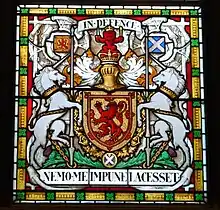 En 1603, Jacobo VI Rey de Escocia heredó el trono del Reino de Inglaterra y dejó Edimburgo por Londres, donde reinaría como Jacobo I de Inglaterra.[29] La Unión era una unión personal o dinástica, con ambas coronas permaneciendo distintas y separadas, a pesar de los esfuerzos de Jacobo para crear un nuevo trono "imperial" de "Gran Bretaña".[30] Jacobo siguió profundamente implicado en los asuntos escoceses, haciendo funcionar al gobierno con el rápido intercambio de correos, ayudado por el establecimiento de un eficiente sistema postal.[31] Controlaba la política de todos los días a través del Consejo Privado de Escocia y administraba el Parlamento de Escocia a través de los Señores de los Artículos. También controló cada vez más las reuniones de la Asamblea General de Escocia y aumentó el número y las competencias de los obispos escoceses. En 1618, celebró una Asamblea General y mediante Five Articles implementó prácticas que habían sido retenidas en Inglaterra y en gran medida abolidas en Escocia, en especial no fue bien recibido arrodillarse para recibir la comunión. Aunque los Five Articles fueron ratificados, crearon amplia oposición y resentimiento y fueron vistos por muchos como un paso hacia atrás para la práctica católica.[32] La autoridad real fue más limitada en las Tierras Altas, donde la violencia periódica interrumpía en las relaciones entre las grandes familias de los MacDonalds, Gordons, McGregors y Campbells.[33] La adquisición de la corona de Irlanda y la inglesa facilitó el establecimiento de los escoceses en la que zona históricamente más problemática de Irlanda, la provincia de Úlster, con quizás 50.000 escoceses instalados en la provincia a mediados del siglo XVII.[34] Los intentos para fundar una colonia escocesa en América del Norte en Nueva Escocia no tuvieron mucho éxito, debido a fondos insuficientes y colonos complacientes.[35]