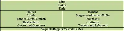 De bajo del rey había un pequeño número de Duques (por lo general descendientes de parientes muy cercanos del rey) y Earls, que formaban la nobleza de alto nivel. Debajo de ellos estaban los barones, que en este período empezaban a fusionarse con los tenants-in-chief locales para convertirse en lairds[100] un grupo más o menos equivalente a los gentleman ingleses.[101] Por debajo de los lairds estaba una variedad de grupos, a menudo mal definidos. Estos incluían a los Yeoman, a veces llamados "Bonnet lairds", y regularmente poseían tierras considerables. La práctica de fueing (por el cual un inquilino pagaba una suma de entrada y una cuota anual o feu, pero podía pasar la tierra a sus herederos) significó en que un número de personas tenían la posesión hereditaria de tierras, que había sido previamente controladas por la iglesia o la nobleza.[102] Estos y los Lairds probablemente eran en suma alrededor de 10.000 en el siglo XVII [103] y se convirtieron en lo que el gobierno definió como heritors, en quienes las cargas financieras y legales del gobierno local caerían cada vez más.[104] Por debajo de los landholders estaban los husbandman, propietarios menores y arrendatarios libres, que a menudo se describen como cottars o grassmen,[105] que constituían la mayoría de la población activa.[106] La servidumbre se había extinguido en Escocia en el siglo XIV, pero fue prácticamente restaurada por la ley estatuaría por los mineros y los salineros.[103] A través del sistema de tribunales Baron y sesiones Kirk, los propietarios todavía ejercían un control considerable sobre sus inquilinos.[107] La sociedad en los burgos fue encabezada por los comerciantes más ricos, que a menudo tenían oficinas locales como burgees, alderman, bailies, o como miembro del consejo.[108] Por debajo de ellos estaban los artesanos y trabajadores que componían la mayoría de la población urbana.[109] En la parte inferior de la sociedad estaban los hombres sin amo, desempleados y vagabundos, cuyo número creció en tiempos de recesión económica o de dificultades.[110]