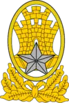 Es hecho de metal amarillo, reproduciendo un castillo dentro de una elipse con el eje mayor vertical y basado en una estrella sencilla, con todo el conjunto soportado de seis hojas de roble, unidas por un lazo de cinta.