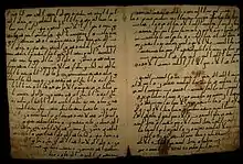 - Biblioteca Británica MS. O. 2165 Manuscrito del Corán temprano escrito en escritura Ma'il, siglo VII u VIII EC