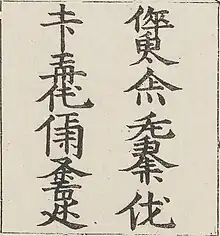 - Jin Qicong (金启孮), Jurchen script Dictionary (女真文辞典), Relic Press (文物出版社), China, 1984, pp.31