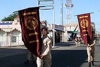 ![]() Miembros de la agrupación durante el desfile cívico militar conmemorativo del movimiento de independencia de México | ||