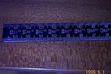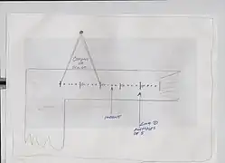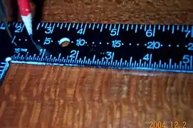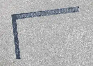 - Se coloca la escuadra sobre una tabla de madera, de modo que las marcas de la huella y la contrahuella deseadas coincidan con el borde de la tabla. Se traza el contorno de la escuadra, que a continuación se desliza hacia arriba del tablero hasta que la huella se coloca en la marca y se repite el proceso (tantas veces como contrahuellas menos dos tenga la escalera)