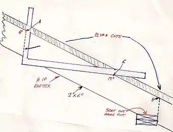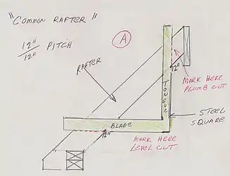 | [4] Para las limatesas y los cabrios también se usa la marca de 12" como referencia para alinear el plano de corte lateral [5] Las vigas de limatesas y limahoya usan la marca de 17" como referencia común para marcar el corte a plomo de una viga [6] El corte lateral es el ángulo biselado de la limatesa o limahoya que encaja en la cumbrera en esta imagen | ||