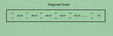 ![]() La escala diagonal da la diagonal, o la hipotenusa, para los diferentes catetos del triángulo para el que se va a cortar una riostra |