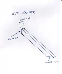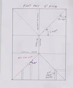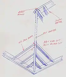 | [1] Elementos de sostenimiento de una cubierta a cuatro aguas [2] En las vigas comunes y los cabrios se suelen usar las marcas de 12" como referencia para marcar los cortes a plomo y a nivel [3] Relación entre una limatesa, los cabrios y las vigas comunes, y cómo se unen a la cumbrera y la placa inferior. Las vigas comunes se sujetan a la viga horizontal de la cumbrera en la cima del techo | ||