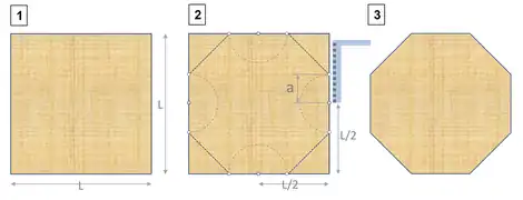 | [1] Tabla octogonal ubicada en la parte frontal de una escuadra de acero [2] Tabla octagonal de una escuadra de aluminio [3] Octágono trazado con la escala octogonal. Un transportador puede realizar la misma tarea | ||