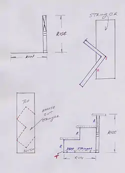 - El larguero de este ejemplo tiene dos escalones intermedios, incorporando un ligero voladizo (denominado albardilla). También se ha dejado libre el espacio vertical entre escalones sucesivos (es decir, no se ponen los tablones de contrahuella). Por último, a la parte inferior del larguero se le debe cortar una tira con el grosor de la tabla usada para los peldaños. Una vez cortada, esta pieza se convierte en la plantilla con la que se recortan los largueros restantes.