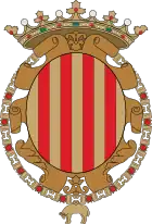 En campo de gules, bajo las barras de Aragón, un castillo dorado sobre una roca batida por el mar. Encuadrando el fuerte, las iniciales A.L.L.A. Y fuera del blasón, sirviéndole de timbre y orla, respectivamente, un coronel abierto y el Toisón de Oro.[1][2]