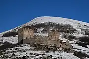 Medio punto cortado 1º en campo de gules, un castillo de plata 2º en campo de oro, cadena de montañas de sinople y sus picos de plata, fileteados de sable, y en punta, ondas de azur y plata bordura general cargada con la leyenda «ALTO CAMPOO FONTES IBERI». Con faldÓn con leyenda << HERMANDAD DE CAMPOO DE SUSO>> | |