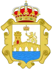 El escudo de Orense figura en un campo de plata, sobre ondas de azur y plata que representan un caudal de agua, un puente de cinco arcos de oro, sumado en su diestra por un castillo de oro, almenado, mazonado de sable y aclarado de gules y a su siniestra, un león rampante, armado uñado y linguado de oro que levanta en su diestra una espada del mismo metal, y en el centro del jefe del escudo una corona real cerrada. El escudo está timbrado con otra corona real, forrada de gules, o rojo, cerrada, que es un círculo de oro, engastado de piedras preciosas, compuesto de ocho florones de hojas de acanto, visibles cinco, interpoladas de perlas y de cada una de sus hojas salen cinco diademas sumadas de perlas que convergen en un mundo azur, con el semimeridiano y el ecuador de oro, sumado de cruz de oro.