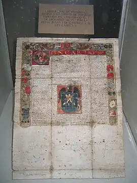 | Blasón | Campo simple con dos Columnas sobre aguas azules y blancas, y encima de ellas una corona del rey de oro con dos blasones (Cruz de Borgoña) que abrazan las dichas dos columnas y salen arriba por dentro de dicha corona,en medio una K de oro. | |