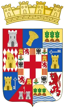Sobre el todo el escudo de de la ciudad de Almería, que muestra en escusón de plata, una cruz de gules; bordura componada: tres de gules, con un castillo, de oro; tres de plata, con un león rampante de gules, coronado de oro; tres de oro, con cuatro palos de gules; tres de oro con un águila de sable y tres de plata, con una granada al natural, rajada de gules.