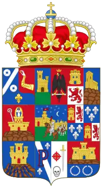 - En el centro de la punta, partido, de azur y terciado, en banda de plata cargada con la letra "P" de azur sombreada de gules acompañada de dos flores de lis de oro, en lo alto y lo bajo; y de plata, una cruz flordeliseada de gules acompañada de un sable enfilado de plata y empuñado de oro, el sable acompañado en su diestra (en el escudo provincial) por una calavera de plata. Es el de Pastrana.