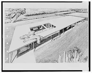 Ralph Twitchell es ampliamente reconocido como el fundador de la "Escuela Sarasota".[8][9] Fue uno de los primeros arquitectos en experimentar con técnicas de construcción de hormigón reforzado ( lamolítico ). Su enfoque arquitectónico orgánico-moderno fue influenciado por los diseños de la casa Usonia de Frank Lloyd Wright: diseño abierto, voladizos, ventanas de cristal, calefacción solar pasiva y enfriamiento natural. Sarasota demostró ser un clima particularmente adecuado para la arquitectura de planta abierta.[10][11]