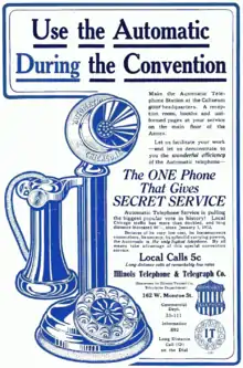 Anuncio del servicio telefónico disponible para los delegados a la convención republicana de 1912 en Chicago. Un importante punto de venta del servicio telefónico de marcación era que era "secreto", ya que no se requería ningún operador para conectar la llamada.