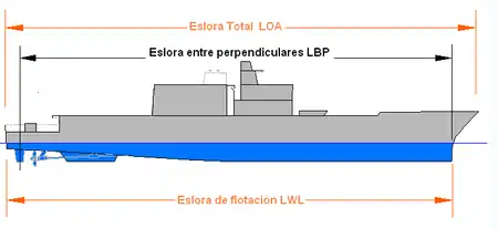 - Eslora de flotación es la longitud del eje longitudinal del plano de flotación considerado. La eslora de flotación está relacionada con las capacidades de navegación del navío. En particular, determina la velocidad máxima que puede alcanzar un navío con casco de desplazamiento. (ing. LWL: Length Water Line).