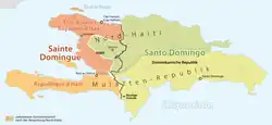 ![]() Haití del Norte en rojo, Haití del Sur en naranja, Santo Domingo en tonos verdes (el Cibao aparece en verde oscuro y el Ozama en verde claro). | |||||||||||||||||||||||||||||||