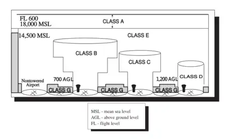 El espacio aéreo está clasificado por la OACI en 7 partes, definidos con una letra de la A a la G. Clase A representa el nivel más alto de control, mientras que las clases F y G son espacio aéreo no controlado. No todos los países tienen todas las clasificaciones de los espacios aéreos, se seleccionan los que más estén acorde a las necesidades que este requiera.
