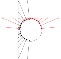 La imagen del ejemplo muestra que P1(R). (aunque los puntos antípoda están identificados en P1(R)). Están cubiertos por dos copias de la recta real R, cada una de las cuales cubre la recta proyectiva excepto un punto, que es «el» (o un) punto en el infinito.