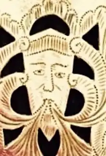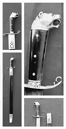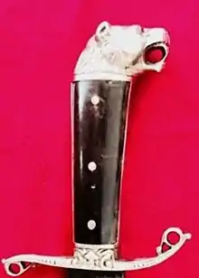 La empuñadura está decorada con la cabeza de un león rugiente, cuya mirada luce encendida por dos piedras de rubí colocadas en los ojos. La cabeza de león simboliza coraje y fuerza, porque históricamente el león ha sido considerado el rey de los animales.[8]