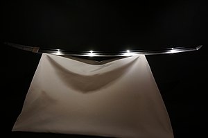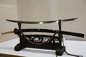 - Katana (刀? "sword"): una espada con una hoja curva de más de 60 cm (no hay un límite de longitud superior, pero generalmente son más cortas que 90 cm), usada con el borde hacia arriba en la faja . Se desarrolló a partir del sasuga, una especie de tantō, alrededor del siglo XIV, y se convirtió en la corriente principal reemplazando al tachi del siglo XV.