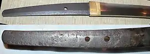Se perfora un agujero a través del tang nakago, llamado mekugi-ana. Se utiliza para anclar la hoja usando un mekugi, un pequeño alfiler de bambú que se inserta en otra cavidad en el mango tsuka y a través del mekugi-ana, evitando así que la hoja se salga. Para quitar el mango se quita el mekugi. La firma mei del herrero está tallada en la espiga.[25]