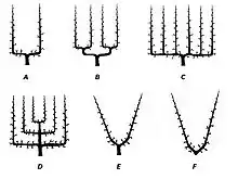 - la palmeta en U, simple o doble: tronco común de donde dos ramas forman una U, eventualmente ramificada también en U.[3]