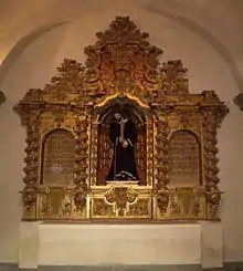 Respecto al Retablo, desde el punto de vista estilístico se puede definir como retablo de columnas salomónicas, de planta recta, escultórico o de talla, y en el que todavía parece cobrar importancia la arquitectura, al menos en el cuerpo, recordando los retablos de arco triunfal tan importantes en el Renacimiento. Su estructura se organiza en banco, cuerpo único y ático, y es de factura dorada intercalando zonas pintadas y estofadas. El banco está decorado con netos ornamentados con cornucopias subientes, entre cuatro pilastras, que lo dividen y de las que salen cuatro ménsulas recurvadas.