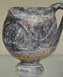 Los colores variados e intensos y los aspectos morfológicos de la fluorita (cristales, bandeados) la han hecho admirada y utilizada por sus valores estéticos al menos desde época romana. La fluorita con bandeados de colores se conocía ya en época romana, utilizándose para tallar en ella vasijas y otros objetos ornamentales. Plinio el Viejo da a esta fluorita bandeada el nombre de murrhina, señalando su uso como material decorativo. Se conservan en algunos museos notables ejemplos de obras de arte de esa época realizadas en fluorita. El origen del material no está claro, aunque al parecer procedía de la zona de Partia.[5] Aunque los romanos explotaron las minas de plomo de Derbyshire, en Gran Bretaña, no parece que encontraran los yacimientos de fluorita bandeada de las cuevas de Blue John y de Treak Cliff, en Castleton.[29]