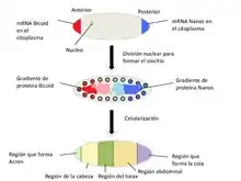 Muchos insectos se basan en la especificación sincitial para comprometer las células a su destino. En embriones tempranos de estos insectos, la división celular no ocurre en su totalidad. El núcleo se divide en el citoplasma del óvulo, creando muchos núcleos dentro de una célula grande. Un citoplasma que tiene muchos núcleos se conoce como sincitio. Sin embargo, el citoplasma del óvulo no es uniforme, pues la parte anterior del citoplasma es marcadamente diferente de la posterior. Aquí, las interacciones de especificación sincitial no ocurren entre células, sino entre las diferentes partes de la misma célula.[4] El caso más conocido de especificación sincitial es el de Drosophila. Experimentos han demostrado que cada núcleo de Drosophila tiene información posicional ( si va formar parte del lado anterior, posterior o mitad del cuerpo) que es dada por proteínas llamadas morfógenos.[1] Los morfógenos son producidos en sitios específicos del embrión, y pueden difundirse a grandes distancias creando gradientes de concentración, donde la mayor concentración es el punto de síntesis y se hace más baja a medida que el morfógeno difunde y degrada con el tiempo. La concentración de morfógenos específicos en un sitio en particular le dice a las células donde están en relación con el sitio de síntesis de estos. La parte más anterior del embrión de Drosophila produce una proteína morfogenética llamada Bicoid, y la parte más posterior produce una proteína llamada Nanos. La concentración de Bicoid es mayor en el lado anterior y disminuye en el posterior, mientras que la proteína Nanos es mayor en el lado posterior y decrece en el anterior. Los núcleos en el citoplasma sincitial de Drosophila serán guiados entonces por la tasa Bicoid:Nanos. Los que se encuentren en regiones con mucho Bicoid y poco Nanos activaran los genes necesarios para producir la cabeza, los que estén en regiones con poco Nanos y poco Bicoid activaran los genes para generar el tórax, y los que se localicen en regiones con poco Bicoid y mucho Nanos formaran las estructuras de la parte abdominal.[5]