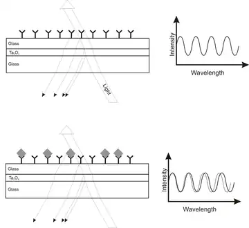 La luz blanca se irradia perpendicularmente a un substrato consistente en varias capas: la primera capa es de SiO2- , la siguiente es de Ta2O5-, que es un material que tiene un índice de refracción alto. La tercera capa es de nuevo de SiO2- esta capa se puede modificar químicamente.