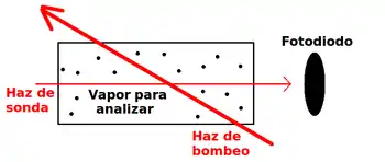Un haz láser inicial se divide en dos mediante un divisor de haz. Los dos rayos son enviados a una cavidad que contiene el vapor, cuyas transiciones se quieren analizar. El primer haz recibe el nombre de haz de bombeo (Pump) mientras que el segundo es el haz de sondeo (Probe). Mientras que la intensidad del primero es elevada y permite excitar los átomos del vapor, el haz de sondeo es diez veces menos intenso y se dirige a un detector (fotodiodo), el cual nos da la señal espectroscópica.